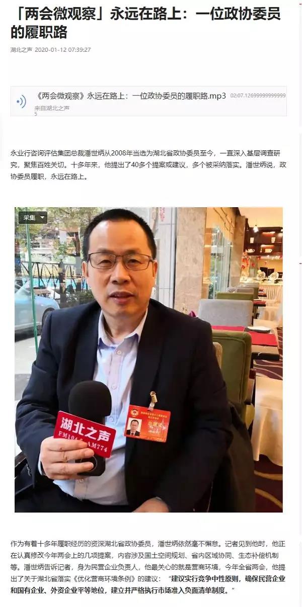 2020年1月11日至15日,政协湖北省十二届三次会议在武汉召开。省政协委员、省房协会长、永业行董事长兼总裁潘世炳参加会议,并向大会提交了《关于推进湖北省实施生态补偿的建议》《关于推进国土空间规划的几个建议》《关于湖北省落实<优化营商环境条例>的几点建议》《深化区域协同 推动鄂黄黄临空协同发展轴建设的几点建议》等多份提案,人民网、《中国经营报》、《湖北日报》、湖北广电、湖北之声、长江云等多家媒体从多个角度对潘世炳委员的提案进行了深度挖掘和报道。