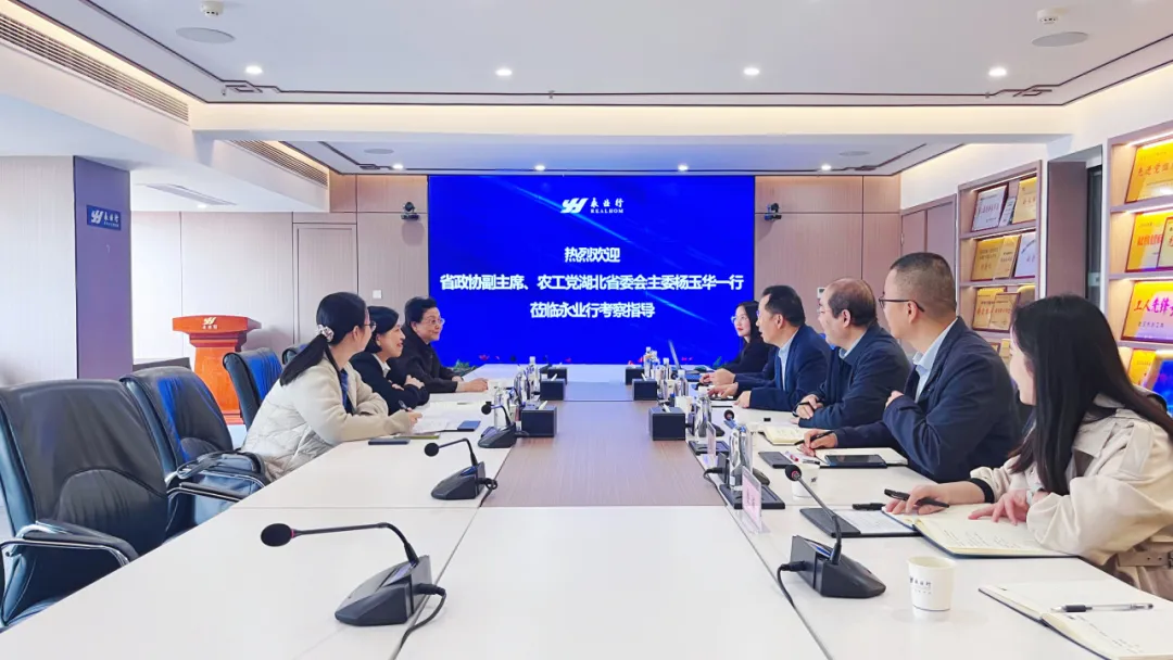 2025年3月21日,湖北省政协副主席、农工党湖北省委会主委杨玉华,农工党湖北省委会专职副主委黄惠宁,组织部部长宋亚琼一行莅临永业行,就筹备成立农工党湖北永业行支部事宜开展座谈交流。永业行党委书记、董事长潘世炳,党委委员、常务副总裁吴学锋,农工党员、助理总裁徐宇初等热情接待并参加座谈。